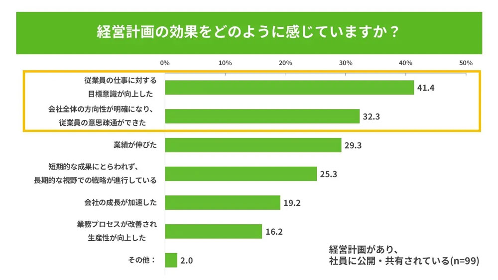 なお、経営計画を運用することによる効果を聞いたところ、「従業員の仕事に対する目標意識が向上した」が41.4%、「会社全体の方向性が明確になり、従業員の意思疎通ができた」が32.3%、「業績が伸びた」が29.3%と、経営計画が社員育成にも業績アップにも貢献していることが分かります。