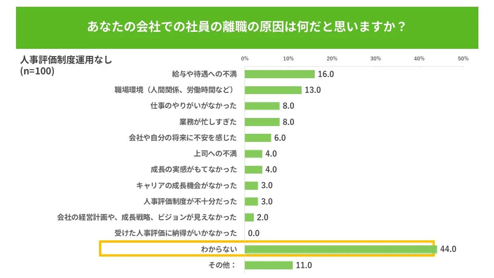 「あなたの会社での社員の離職原因は何だと思いますか?」という質問に対し、人事評価制度のある会社では「職場環境」や「給与や待遇への不満」といった明確な原因が多くを占めています。一方、人事評価制度のない企業では離職原因を「わからない」と回答した割合が44.0%で、最多の結果となりました。この結果からは、経営層と従業員のコミュニケーション不足が離職の要因となっている可能性が示唆されます。