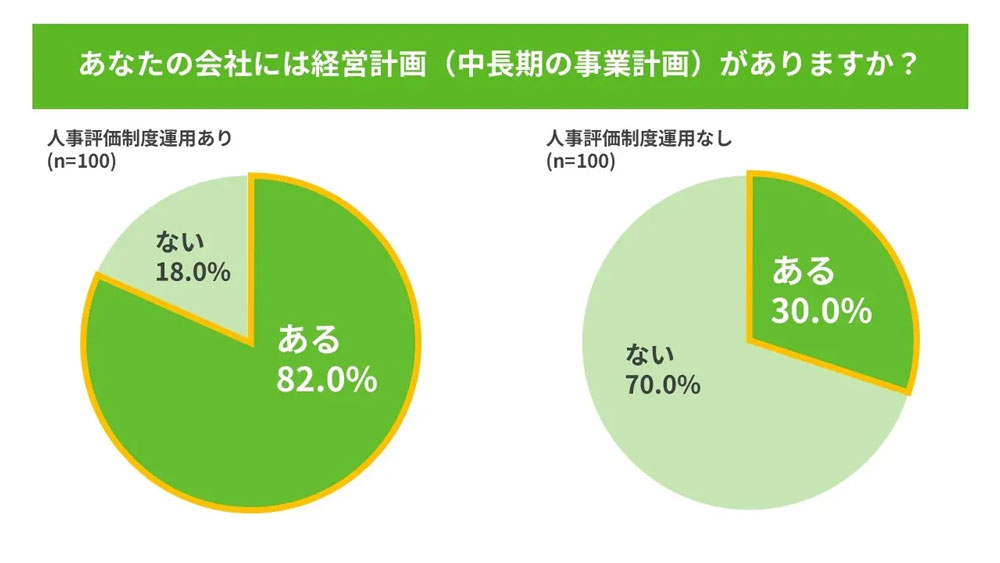 人事評価制度だけでなく経営計画も運用しているか聞いたところ、人事評価制度を運用している中小企業の82.0%が経営計画も運用していました。一方で、人事評価制度のない中小企業で経営計画を運用している割合は30.0%と低い結果になっています。